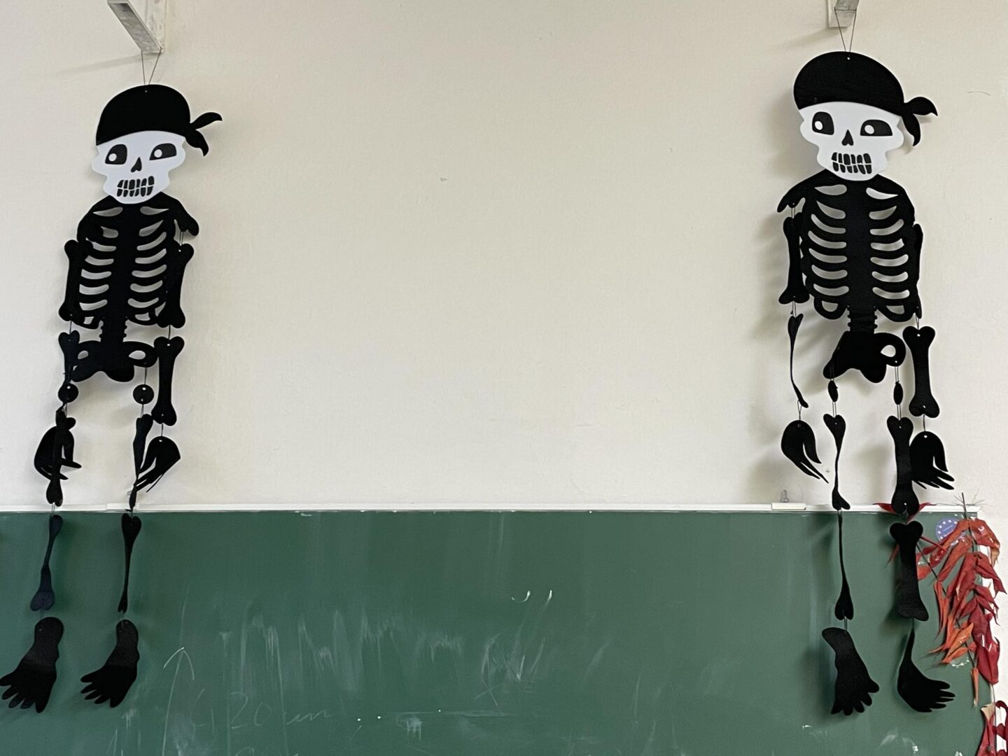 Žiaci si vyzdobili nielen dvere, ale aj katedru a okenné parapety. Najviac zaujala kostra zavesená na okne a náhrobný kameň pred katedrou.