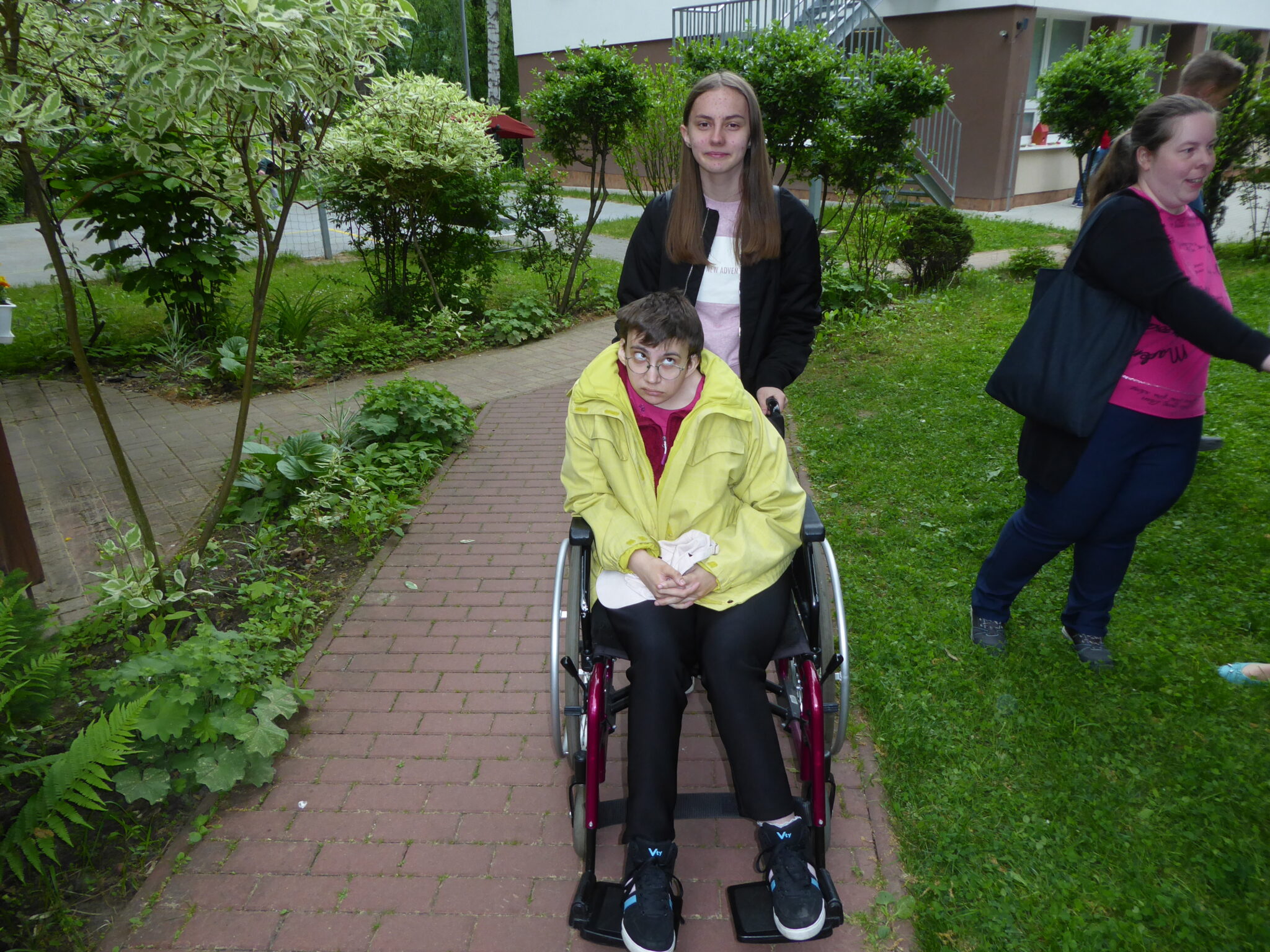V DSS SYNÓMIA sú ubytovaní klienti, pre ktorých sa zariadenie stalo domovom, ale aj klienti, ktorí chodia do zariadenia len na pár hodín denne. Zariadenie poskytuje sociálne služby na riešenie nepriaznivej sociálnej situácie z dôvodu ŤZP alebo nepriaznivého zdravotného stavu vo forme pobytovej a ambulantnej služby ľuďom, ktorí ešte nedosiahli dôchodkový vek. V zariadení prebiehajú rôzne terapie a činnosti pre klientov: canisterapia – terapia pomocou špeciálne vycvičených psov, činnostná terapia, fyzikálna a sociálna terapia, arteterapia – terapia umením, muzikoterapia a podobne. Na úvod našej návštevy sme sa zoznámili s pani riaditeľkou DSS, ktorá nám porozprávala o histórií a činnosti zariadenia. Postupne sa naši žiaci osmelili a začali sa zoznamovať s klientami zariadenia, ktorí boli veľmi priateľskí a našli si medzi našimi žiakmi nových kamarátov. Niektorých klientov DSS žiaci vozili na vozíčkoch po záhrade zariadenia a s inými si zahrali rôzne športové hry ako futbal, basketbal alebo stolný tenis. Klienti viedli rozhovory s našimi žiakmi a chceli sa o nich dozvedieť čo najviac. Žiaci pomohli aj pohrabať lístie a skrášliť prostredie v areáli zariadenia.