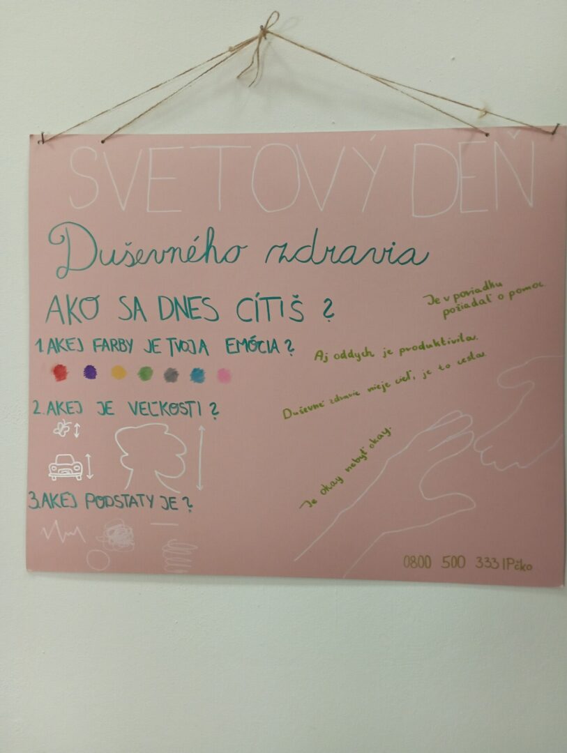 Ubytované žiačky v školskom internáte vyrobili pútač s názvom „Svetový deň duševného zdravia“, na ktorom sa zúčastnili: Kopecká Alžbeta, Pytláková Natália a Mamojková Iveta.