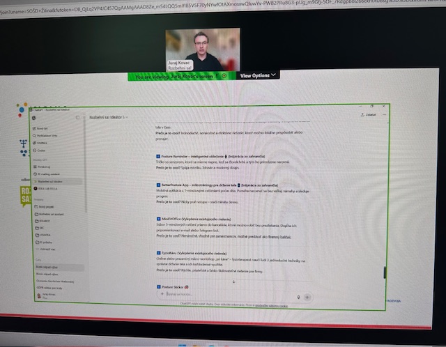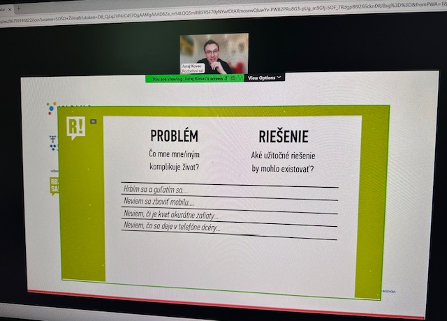 V úvode všetky zapojené stredné školy privítal manažér Juraj Kováč – podporovateľ startupov a projektov od nuly – Rozbehni sa. www.rozbehnisa.sk . Počas celého webinára robil moderátora. Rovnako sa úvodného slova zhostila aj autorka webináru Janka Valová zo spoločnosti INOVIA – inovačné centrum, ktoré premieňa myšlienky a nápady na projekty s reálnymi výsledkami www.inovia.sk .