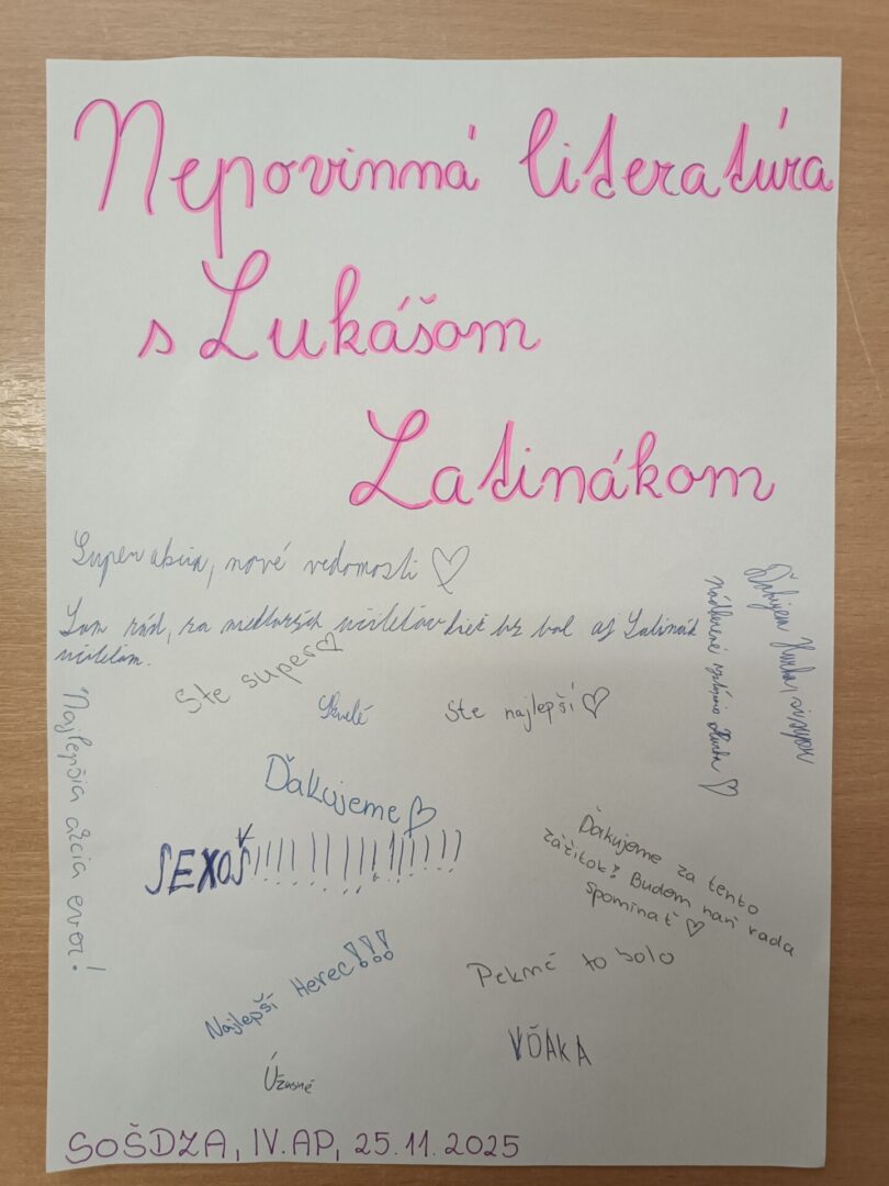 Pod názvom Nepovinné čítanie s Lukášom Latinákom sa skrývalo podujatie, ktoré od prvej minúty pritiahlo pozornosť našich žiakov aj pedagógov.
