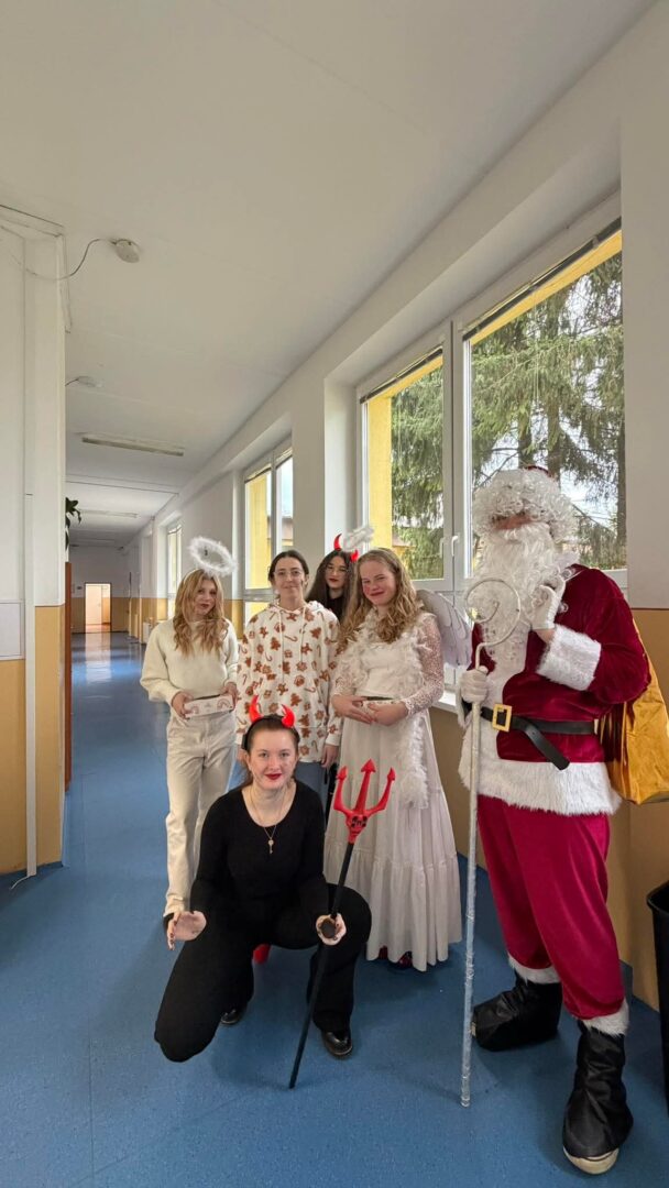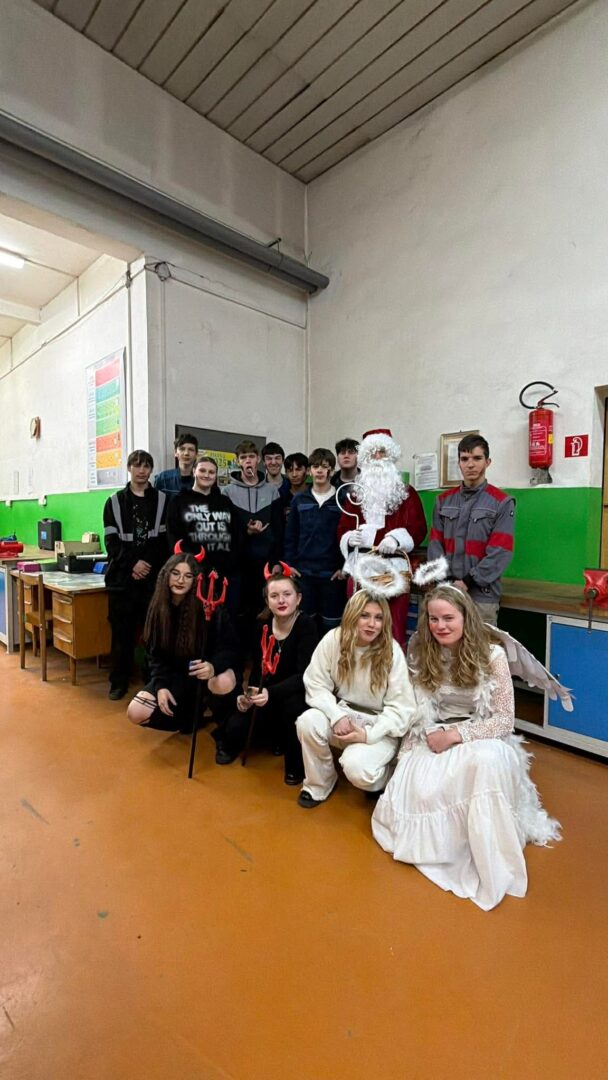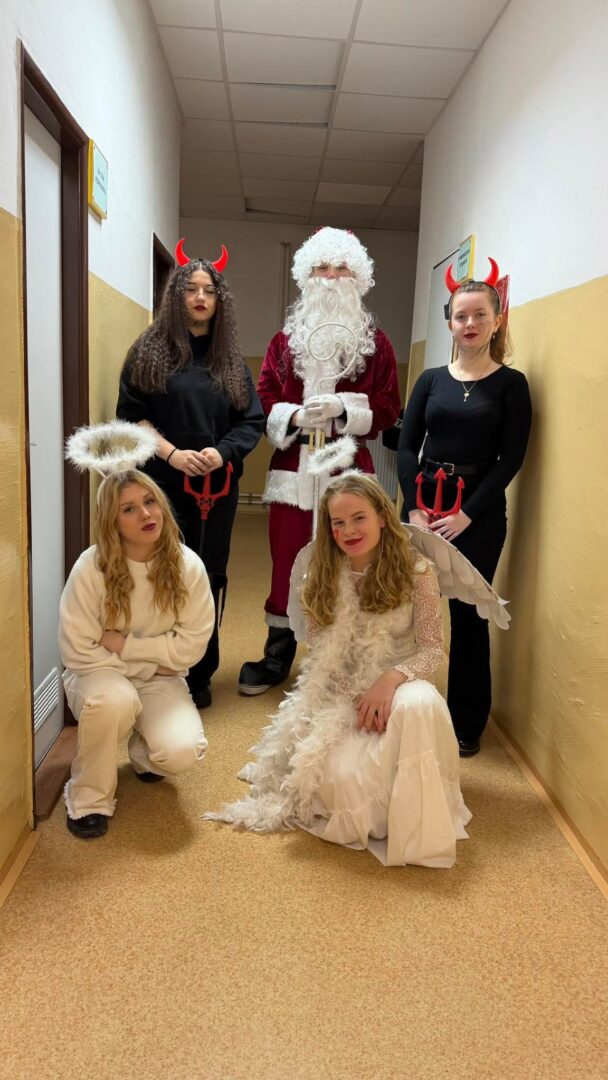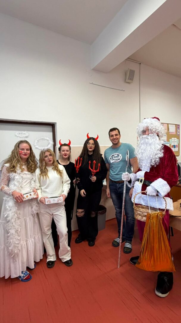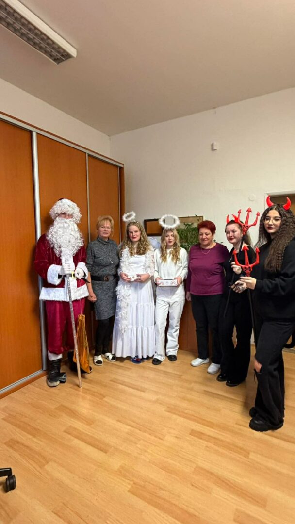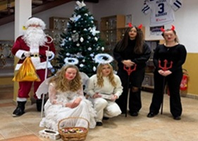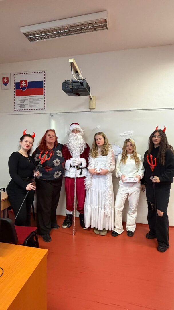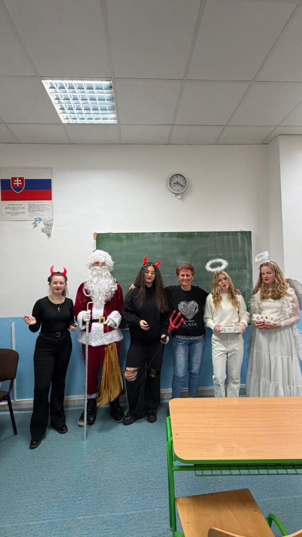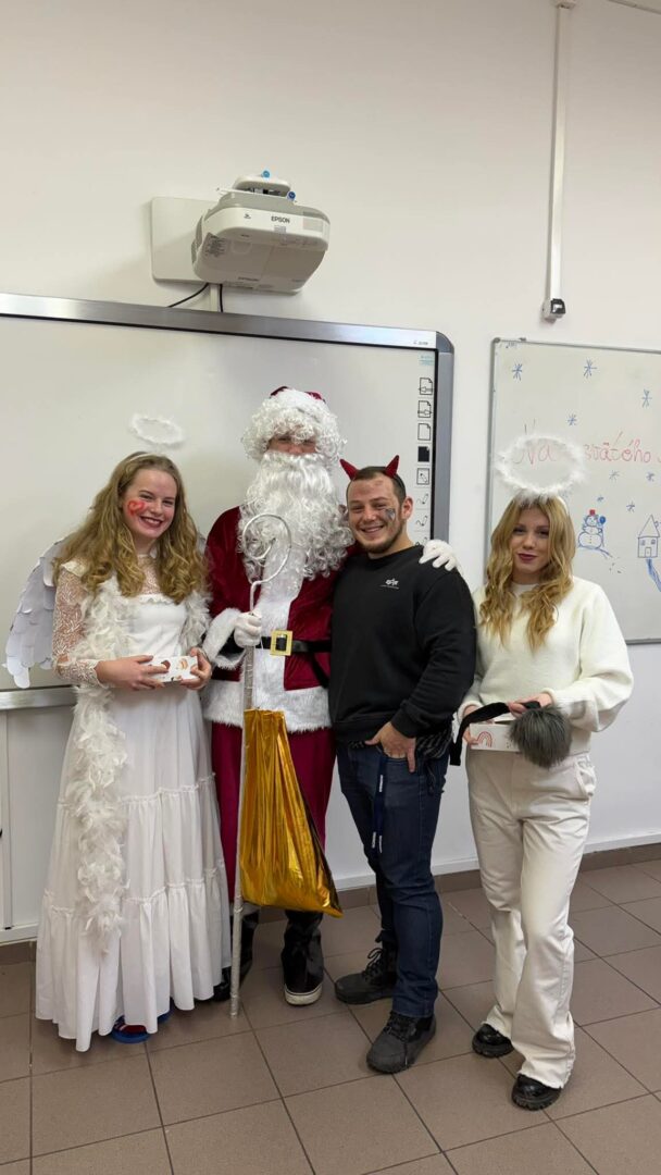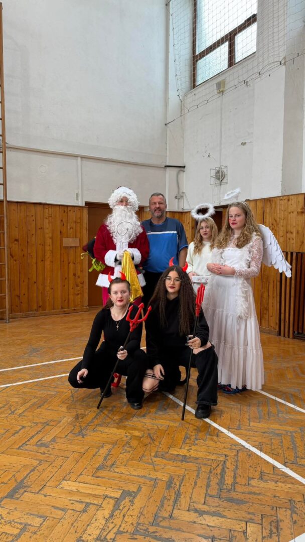 Ten náš „dopravácky“ sa rozhodol, že aj našim žiakom spestrí toto vianočné obdobie. Do školy dorazil v dobrej nálade, sprevádzaný svojimi tradičným pomocníkmi – anjelmi a čertami, ktorí sa postarali o dobrú náladu počas vyučovania. Atmosféra bola sviatočná a srdečná.