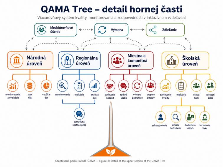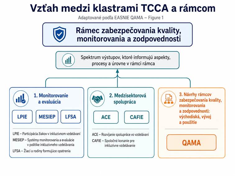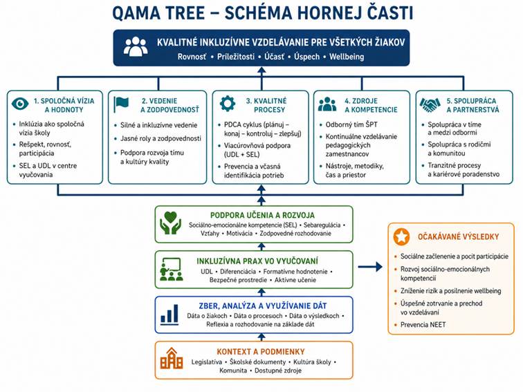 Pri rozvoji podpory vychádzame z legislatívy SR, princípov EQAVET a európskeho rámca inkluzívneho vzdelávania. Opierame sa aj o prístupy Európskej agentúry pre vzdelávanie detí so špeciálnymi potrebami a inkluzívne vzdelávanie (EASNIE) a dokument QAMA, ktoré zdôrazňujú potrebu viacúrovňového systému kvality, monitorovania, zodpovednosti a využívania dát na rozvoj inkluzívnej praxe.
