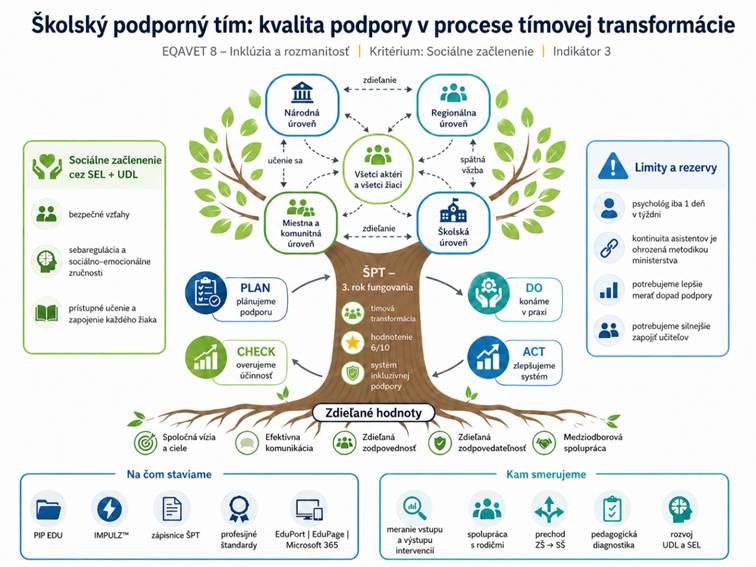 Náš školský podporný tím pôsobí systematicky na škole tretí rok. Sme preto v prirodzenom procese tímovej transformácie: od nastavovania základov, rolí a dokumentácie smerujeme k jednotnému, koordinovanému a merateľnému systému inkluzívnej podpory. Hodnotenie 6 z 10 nevnímame ako slabinu, ale ako rozvojový ukazovateľ. Máme vytvorené základy odborného tímu, procesov, nástrojov a dôkazov, no zároveň pomenúvame limity a priestor na ďalšie zlepšovanie.